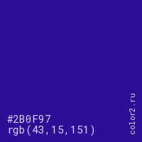 Цвет #2B0F97 в цветовой модели RGB обозначается тремя октетами (43, 15, 151) в десятичном формате и #2B0F97 в шестнадцатиричном (hex) формате, которые являются интенсивностью красного 43 (hex 2B), интенсивность зелёного 15 (hex 0F) и интенсивность синего 151 (hex 97).