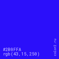 Цвет #2B0FFA в цветовой модели RGB обозначается тремя октетами (43, 15, 250) в десятичном формате и #2B0FFA в шестнадцатиричном (hex) формате, которые являются интенсивностью красного 43 (hex 2B), интенсивность зелёного 15 (hex 0F) и интенсивность синего 250 (hex FA).