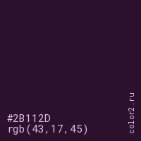 Цвет #2B112D в цветовой модели RGB обозначается тремя октетами (43, 17, 45) в десятичном формате и #2B112D в шестнадцатиричном (hex) формате, которые являются интенсивностью красного 43 (hex 2B), интенсивность зелёного 17 (hex 11) и интенсивность синего 45 (hex 2D).
