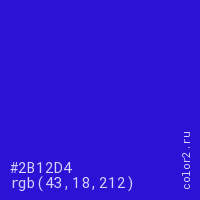 Цвет #2B12D4 в цветовой модели RGB обозначается тремя октетами (43, 18, 212) в десятичном формате и #2B12D4 в шестнадцатиричном (hex) формате, которые являются интенсивностью красного 43 (hex 2B), интенсивность зелёного 18 (hex 12) и интенсивность синего 212 (hex D4).