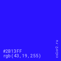Цвет #2B13FF в цветовой модели RGB обозначается тремя октетами (43, 19, 255) в десятичном формате и #2B13FF в шестнадцатиричном (hex) формате, которые являются интенсивностью красного 43 (hex 2B), интенсивность зелёного 19 (hex 13) и интенсивность синего 255 (hex FF).