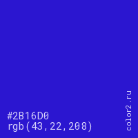 Цвет #2B16D0 в цветовой модели RGB обозначается тремя октетами (43, 22, 208) в десятичном формате и #2B16D0 в шестнадцатиричном (hex) формате, которые являются интенсивностью красного 43 (hex 2B), интенсивность зелёного 22 (hex 16) и интенсивность синего 208 (hex D0).