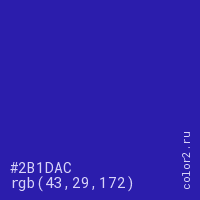 Цвет #2B1DAC в цветовой модели RGB обозначается тремя октетами (43, 29, 172) в десятичном формате и #2B1DAC в шестнадцатиричном (hex) формате, которые являются интенсивностью красного 43 (hex 2B), интенсивность зелёного 29 (hex 1D) и интенсивность синего 172 (hex AC).