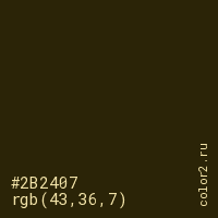 Цвет #2B2407 в цветовой модели RGB обозначается тремя октетами (43, 36, 7) в десятичном формате и #2B2407 в шестнадцатиричном (hex) формате, которые являются интенсивностью красного 43 (hex 2B), интенсивность зелёного 36 (hex 24) и интенсивность синего 7 (hex 07).