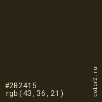 Цвет #2B2415 в цветовой модели RGB обозначается тремя октетами (43, 36, 21) в десятичном формате и #2B2415 в шестнадцатиричном (hex) формате, которые являются интенсивностью красного 43 (hex 2B), интенсивность зелёного 36 (hex 24) и интенсивность синего 21 (hex 15).