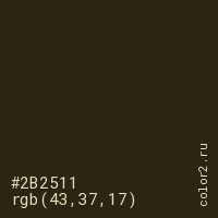 Цвет #2B2511 в цветовой модели RGB обозначается тремя октетами (43, 37, 17) в десятичном формате и #2B2511 в шестнадцатиричном (hex) формате, которые являются интенсивностью красного 43 (hex 2B), интенсивность зелёного 37 (hex 25) и интенсивность синего 17 (hex 11).