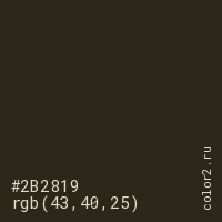 Цвет #2B2819 в цветовой модели RGB обозначается тремя октетами (43, 40, 25) в десятичном формате и #2B2819 в шестнадцатиричном (hex) формате, которые являются интенсивностью красного 43 (hex 2B), интенсивность зелёного 40 (hex 28) и интенсивность синего 25 (hex 19).