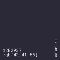Цвет #2B2937 в цветовой модели RGB обозначается тремя октетами (43, 41, 55) в десятичном формате и #2B2937 в шестнадцатиричном (hex) формате, которые являются интенсивностью красного 43 (hex 2B), интенсивность зелёного 41 (hex 29) и интенсивность синего 55 (hex 37).