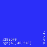 Цвет #2B2DF9 в цветовой модели RGB обозначается тремя октетами (43, 45, 249) в десятичном формате и #2B2DF9 в шестнадцатиричном (hex) формате, которые являются интенсивностью красного 43 (hex 2B), интенсивность зелёного 45 (hex 2D) и интенсивность синего 249 (hex F9).