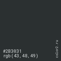 Цвет #2B3031 в цветовой модели RGB обозначается тремя октетами (43, 48, 49) в десятичном формате и #2B3031 в шестнадцатиричном (hex) формате, которые являются интенсивностью красного 43 (hex 2B), интенсивность зелёного 48 (hex 30) и интенсивность синего 49 (hex 31).