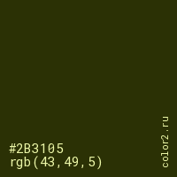 Цвет #2B3105 в цветовой модели RGB обозначается тремя октетами (43, 49, 5) в десятичном формате и #2B3105 в шестнадцатиричном (hex) формате, которые являются интенсивностью красного 43 (hex 2B), интенсивность зелёного 49 (hex 31) и интенсивность синего 5 (hex 05).