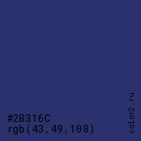 Цвет #2B316C в цветовой модели RGB обозначается тремя октетами (43, 49, 108) в десятичном формате и #2B316C в шестнадцатиричном (hex) формате, которые являются интенсивностью красного 43 (hex 2B), интенсивность зелёного 49 (hex 31) и интенсивность синего 108 (hex 6C).