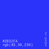 Цвет #2B32FA в цветовой модели RGB обозначается тремя октетами (43, 50, 250) в десятичном формате и #2B32FA в шестнадцатиричном (hex) формате, которые являются интенсивностью красного 43 (hex 2B), интенсивность зелёного 50 (hex 32) и интенсивность синего 250 (hex FA).