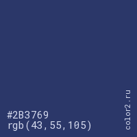 Цвет #2B3769 в цветовой модели RGB обозначается тремя октетами (43, 55, 105) в десятичном формате и #2B3769 в шестнадцатиричном (hex) формате, которые являются интенсивностью красного 43 (hex 2B), интенсивность зелёного 55 (hex 37) и интенсивность синего 105 (hex 69).
