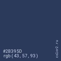 Цвет #2B395D в цветовой модели RGB обозначается тремя октетами (43, 57, 93) в десятичном формате и #2B395D в шестнадцатиричном (hex) формате, которые являются интенсивностью красного 43 (hex 2B), интенсивность зелёного 57 (hex 39) и интенсивность синего 93 (hex 5D).