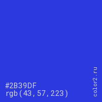 Цвет #2B39DF в цветовой модели RGB обозначается тремя октетами (43, 57, 223) в десятичном формате и #2B39DF в шестнадцатиричном (hex) формате, которые являются интенсивностью красного 43 (hex 2B), интенсивность зелёного 57 (hex 39) и интенсивность синего 223 (hex DF).