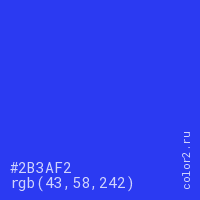 Цвет #2B3AF2 в цветовой модели RGB обозначается тремя октетами (43, 58, 242) в десятичном формате и #2B3AF2 в шестнадцатиричном (hex) формате, которые являются интенсивностью красного 43 (hex 2B), интенсивность зелёного 58 (hex 3A) и интенсивность синего 242 (hex F2).