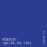Цвет #2B3C91 в цветовой модели RGB обозначается тремя октетами (43, 60, 145) в десятичном формате и #2B3C91 в шестнадцатиричном (hex) формате, которые являются интенсивностью красного 43 (hex 2B), интенсивность зелёного 60 (hex 3C) и интенсивность синего 145 (hex 91).