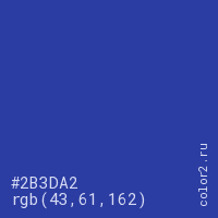 Цвет #2B3DA2 в цветовой модели RGB обозначается тремя октетами (43, 61, 162) в десятичном формате и #2B3DA2 в шестнадцатиричном (hex) формате, которые являются интенсивностью красного 43 (hex 2B), интенсивность зелёного 61 (hex 3D) и интенсивность синего 162 (hex A2).