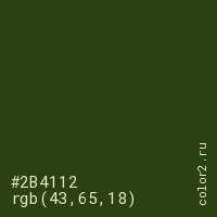 Цвет #2B4112 в цветовой модели RGB обозначается тремя октетами (43, 65, 18) в десятичном формате и #2B4112 в шестнадцатиричном (hex) формате, которые являются интенсивностью красного 43 (hex 2B), интенсивность зелёного 65 (hex 41) и интенсивность синего 18 (hex 12).
