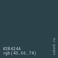 Цвет #2B424A в цветовой модели RGB обозначается тремя октетами (43, 66, 74) в десятичном формате и #2B424A в шестнадцатиричном (hex) формате, которые являются интенсивностью красного 43 (hex 2B), интенсивность зелёного 66 (hex 42) и интенсивность синего 74 (hex 4A).