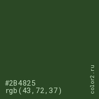 Цвет #2B4825 в цветовой модели RGB обозначается тремя октетами (43, 72, 37) в десятичном формате и #2B4825 в шестнадцатиричном (hex) формате, которые являются интенсивностью красного 43 (hex 2B), интенсивность зелёного 72 (hex 48) и интенсивность синего 37 (hex 25).