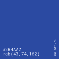 Цвет #2B4AA2 в цветовой модели RGB обозначается тремя октетами (43, 74, 162) в десятичном формате и #2B4AA2 в шестнадцатиричном (hex) формате, которые являются интенсивностью красного 43 (hex 2B), интенсивность зелёного 74 (hex 4A) и интенсивность синего 162 (hex A2).