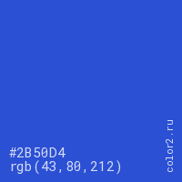 Цвет #2B50D4 в цветовой модели RGB обозначается тремя октетами (43, 80, 212) в десятичном формате и #2B50D4 в шестнадцатиричном (hex) формате, которые являются интенсивностью красного 43 (hex 2B), интенсивность зелёного 80 (hex 50) и интенсивность синего 212 (hex D4).