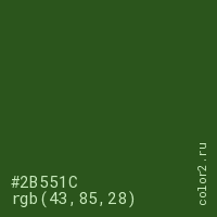 Цвет #2B551C в цветовой модели RGB обозначается тремя октетами (43, 85, 28) в десятичном формате и #2B551C в шестнадцатиричном (hex) формате, которые являются интенсивностью красного 43 (hex 2B), интенсивность зелёного 85 (hex 55) и интенсивность синего 28 (hex 1C).