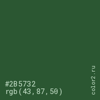 Цвет #2B5732 в цветовой модели RGB обозначается тремя октетами (43, 87, 50) в десятичном формате и #2B5732 в шестнадцатиричном (hex) формате, которые являются интенсивностью красного 43 (hex 2B), интенсивность зелёного 87 (hex 57) и интенсивность синего 50 (hex 32).