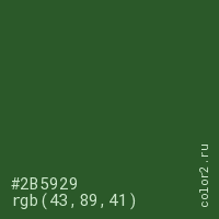 Цвет #2B5929 в цветовой модели RGB обозначается тремя октетами (43, 89, 41) в десятичном формате и #2B5929 в шестнадцатиричном (hex) формате, которые являются интенсивностью красного 43 (hex 2B), интенсивность зелёного 89 (hex 59) и интенсивность синего 41 (hex 29).