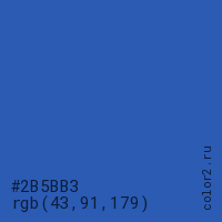 Цвет #2B5BB3 в цветовой модели RGB обозначается тремя октетами (43, 91, 179) в десятичном формате и #2B5BB3 в шестнадцатиричном (hex) формате, которые являются интенсивностью красного 43 (hex 2B), интенсивность зелёного 91 (hex 5B) и интенсивность синего 179 (hex B3).