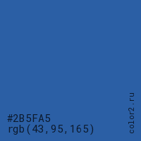 Цвет #2B5FA5 в цветовой модели RGB обозначается тремя октетами (43, 95, 165) в десятичном формате и #2B5FA5 в шестнадцатиричном (hex) формате, которые являются интенсивностью красного 43 (hex 2B), интенсивность зелёного 95 (hex 5F) и интенсивность синего 165 (hex A5).