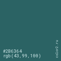 Цвет #2B6364 в цветовой модели RGB обозначается тремя октетами (43, 99, 100) в десятичном формате и #2B6364 в шестнадцатиричном (hex) формате, которые являются интенсивностью красного 43 (hex 2B), интенсивность зелёного 99 (hex 63) и интенсивность синего 100 (hex 64).