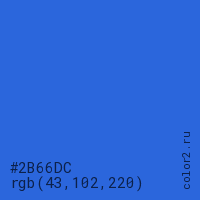 Цвет #2B66DC в цветовой модели RGB обозначается тремя октетами (43, 102, 220) в десятичном формате и #2B66DC в шестнадцатиричном (hex) формате, которые являются интенсивностью красного 43 (hex 2B), интенсивность зелёного 102 (hex 66) и интенсивность синего 220 (hex DC).