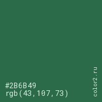 Цвет #2B6B49 в цветовой модели RGB обозначается тремя октетами (43, 107, 73) в десятичном формате и #2B6B49 в шестнадцатиричном (hex) формате, которые являются интенсивностью красного 43 (hex 2B), интенсивность зелёного 107 (hex 6B) и интенсивность синего 73 (hex 49).