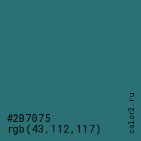 Цвет #2B7075 в цветовой модели RGB обозначается тремя октетами (43, 112, 117) в десятичном формате и #2B7075 в шестнадцатиричном (hex) формате, которые являются интенсивностью красного 43 (hex 2B), интенсивность зелёного 112 (hex 70) и интенсивность синего 117 (hex 75).