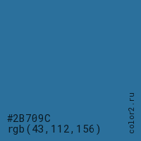 Цвет #2B709C в цветовой модели RGB обозначается тремя октетами (43, 112, 156) в десятичном формате и #2B709C в шестнадцатиричном (hex) формате, которые являются интенсивностью красного 43 (hex 2B), интенсивность зелёного 112 (hex 70) и интенсивность синего 156 (hex 9C).