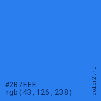 Цвет #2B7EEE в цветовой модели RGB обозначается тремя октетами (43, 126, 238) в десятичном формате и #2B7EEE в шестнадцатиричном (hex) формате, которые являются интенсивностью красного 43 (hex 2B), интенсивность зелёного 126 (hex 7E) и интенсивность синего 238 (hex EE).