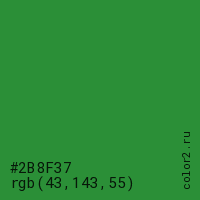 Цвет #2B8F37 в цветовой модели RGB обозначается тремя октетами (43, 143, 55) в десятичном формате и #2B8F37 в шестнадцатиричном (hex) формате, которые являются интенсивностью красного 43 (hex 2B), интенсивность зелёного 143 (hex 8F) и интенсивность синего 55 (hex 37).