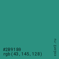 Цвет #2B9180 в цветовой модели RGB обозначается тремя октетами (43, 145, 128) в десятичном формате и #2B9180 в шестнадцатиричном (hex) формате, которые являются интенсивностью красного 43 (hex 2B), интенсивность зелёного 145 (hex 91) и интенсивность синего 128 (hex 80).