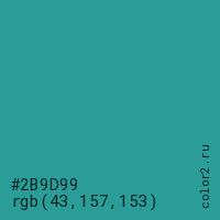 Цвет #2B9D99 в цветовой модели RGB обозначается тремя октетами (43, 157, 153) в десятичном формате и #2B9D99 в шестнадцатиричном (hex) формате, которые являются интенсивностью красного 43 (hex 2B), интенсивность зелёного 157 (hex 9D) и интенсивность синего 153 (hex 99).