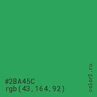 Цвет #2BA45C в цветовой модели RGB обозначается тремя октетами (43, 164, 92) в десятичном формате и #2BA45C в шестнадцатиричном (hex) формате, которые являются интенсивностью красного 43 (hex 2B), интенсивность зелёного 164 (hex A4) и интенсивность синего 92 (hex 5C).