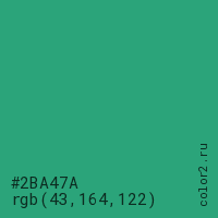 Цвет #2BA47A в цветовой модели RGB обозначается тремя октетами (43, 164, 122) в десятичном формате и #2BA47A в шестнадцатиричном (hex) формате, которые являются интенсивностью красного 43 (hex 2B), интенсивность зелёного 164 (hex A4) и интенсивность синего 122 (hex 7A).
