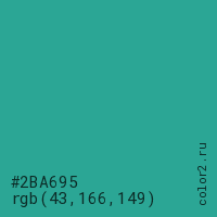Цвет #2BA695 в цветовой модели RGB обозначается тремя октетами (43, 166, 149) в десятичном формате и #2BA695 в шестнадцатиричном (hex) формате, которые являются интенсивностью красного 43 (hex 2B), интенсивность зелёного 166 (hex A6) и интенсивность синего 149 (hex 95).