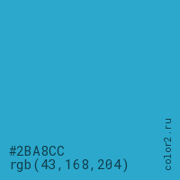Цвет #2BA8CC в цветовой модели RGB обозначается тремя октетами (43, 168, 204) в десятичном формате и #2BA8CC в шестнадцатиричном (hex) формате, которые являются интенсивностью красного 43 (hex 2B), интенсивность зелёного 168 (hex A8) и интенсивность синего 204 (hex CC).