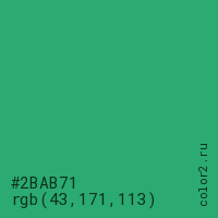 Цвет #2BAB71 в цветовой модели RGB обозначается тремя октетами (43, 171, 113) в десятичном формате и #2BAB71 в шестнадцатиричном (hex) формате, которые являются интенсивностью красного 43 (hex 2B), интенсивность зелёного 171 (hex AB) и интенсивность синего 113 (hex 71).