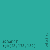 Цвет #2BAD9F в цветовой модели RGB обозначается тремя октетами (43, 173, 159) в десятичном формате и #2BAD9F в шестнадцатиричном (hex) формате, которые являются интенсивностью красного 43 (hex 2B), интенсивность зелёного 173 (hex AD) и интенсивность синего 159 (hex 9F).