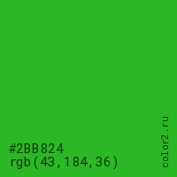 Цвет #2BB824 в цветовой модели RGB обозначается тремя октетами (43, 184, 36) в десятичном формате и #2BB824 в шестнадцатиричном (hex) формате, которые являются интенсивностью красного 43 (hex 2B), интенсивность зелёного 184 (hex B8) и интенсивность синего 36 (hex 24).