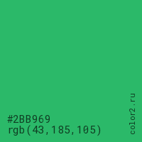 Цвет #2BB969 в цветовой модели RGB обозначается тремя октетами (43, 185, 105) в десятичном формате и #2BB969 в шестнадцатиричном (hex) формате, которые являются интенсивностью красного 43 (hex 2B), интенсивность зелёного 185 (hex B9) и интенсивность синего 105 (hex 69).